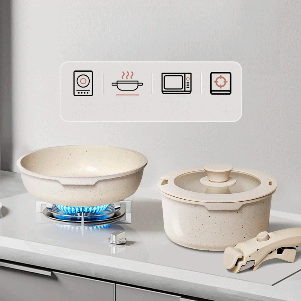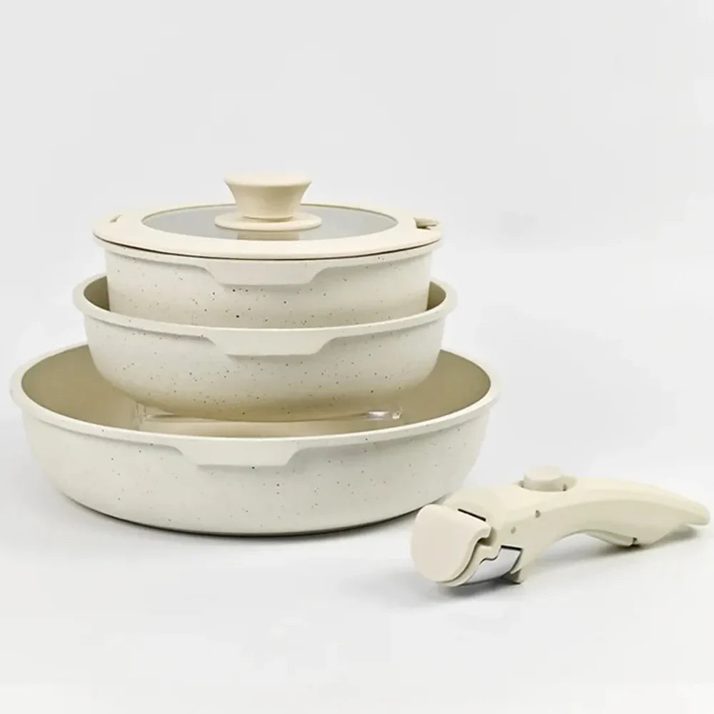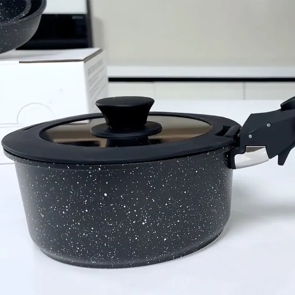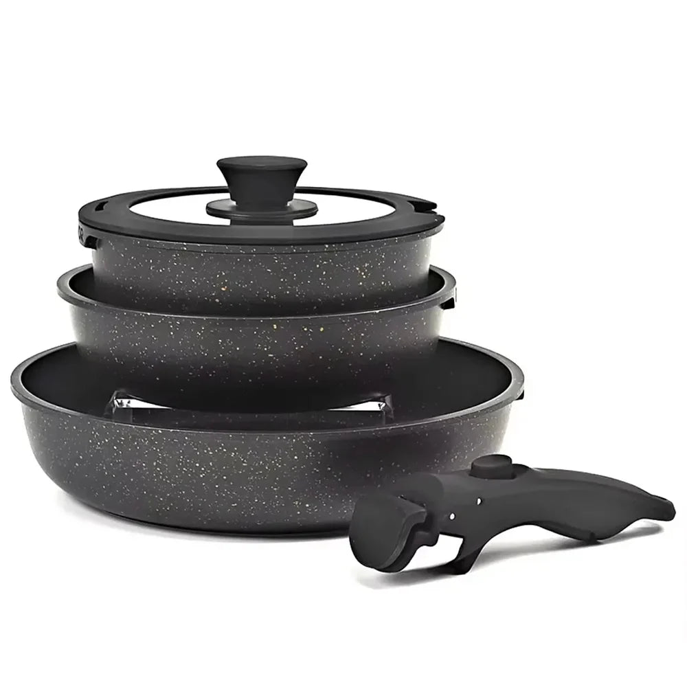 👉🏼 El Juego de 3 Ollas y Sartenes Antiadherentes con Mango ExtraĂble y Tapa es ideal para ahorrar espacio, cocinar sin esfuerzo y limpiar más fácil.