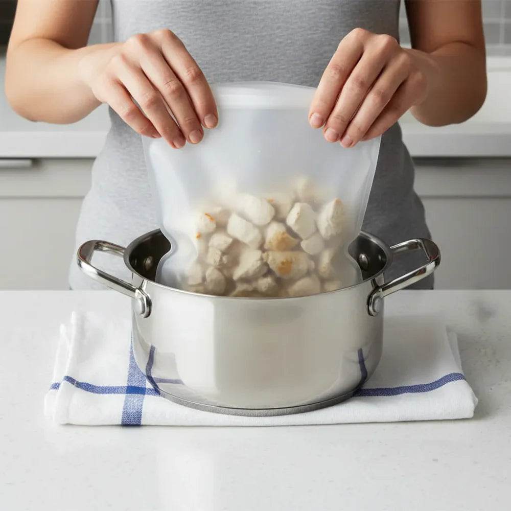 ❄️ Conservación Inteligente en la Cocina con el combo: Bolsas Reutilizables + Contenedor de Líquidos Milhome de Regalo.