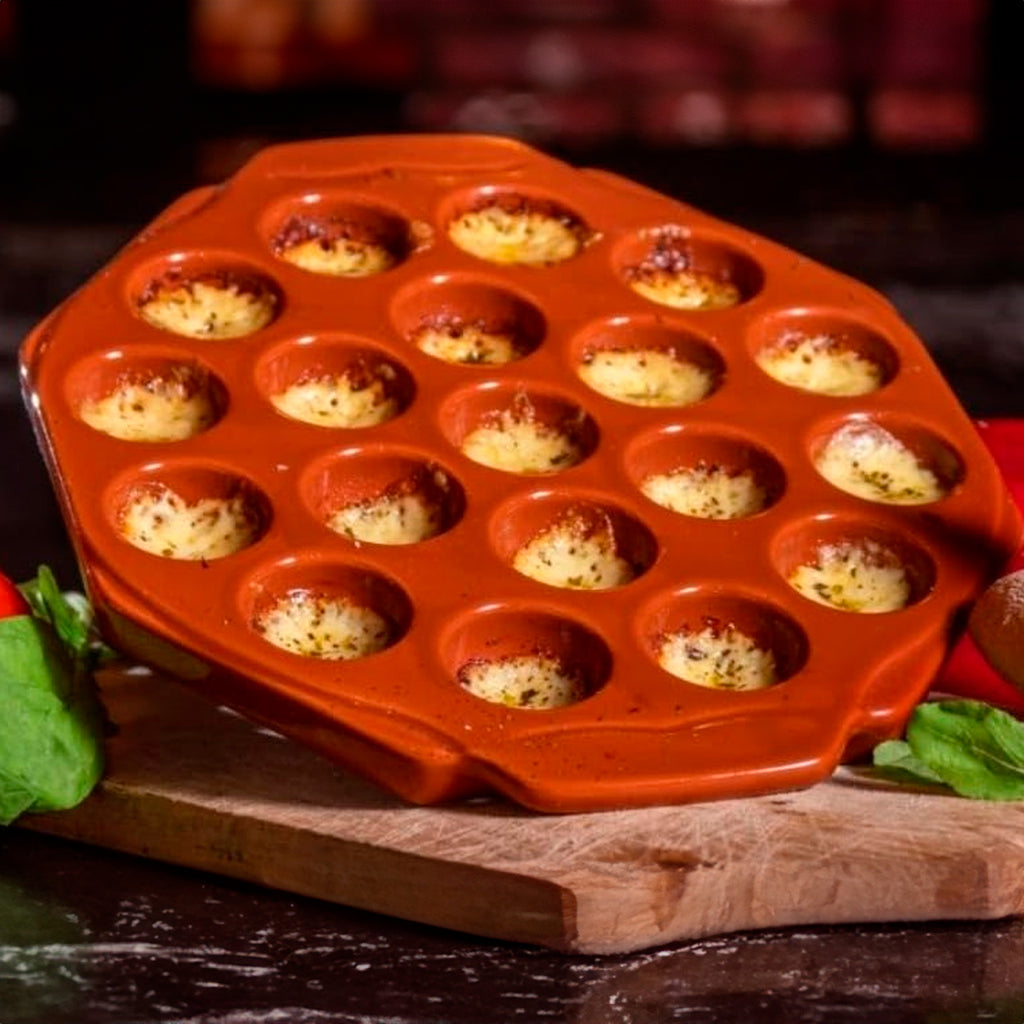 La Provolonera de Cerámica Terracota con 19 Particiones está diseñada para ofrecer porciones individuales con estilo y funcionalidad.
